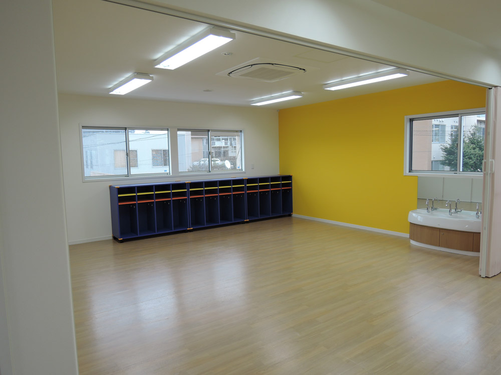 壁、家具に鮮やかな色を用いることで、園児自身の保育室の認識、明るく楽しげな空間を創ることを意識した。